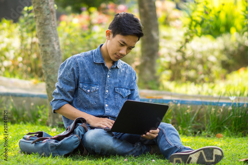 Asian young man using computer outdoor