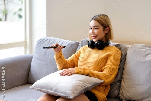 Asian young beautiful woman watching fun movie on television at home. Attractive casual girl feel happy and relax, sit on sofa having fun watch comedy video on TV in house. Activity lifestyles concept