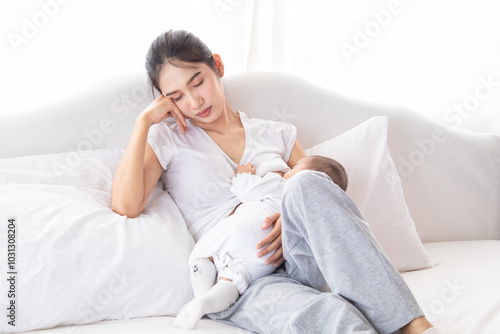 Asian Young mother holding her newborn child and breastfeeds baby, mom was exhausted from raising children. Adorable infant sucking a woman's breast after waking up in the morning. lady feeding baby.