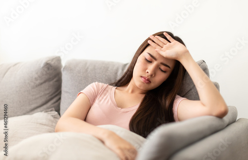 Asian young woman holding her hands on the forehead and have a headache on the sofa.