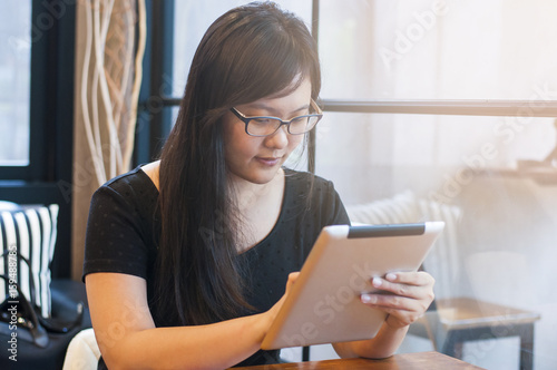 Asian young woman wear glasses working on digital tablet at coffee cafe, work life integration concept