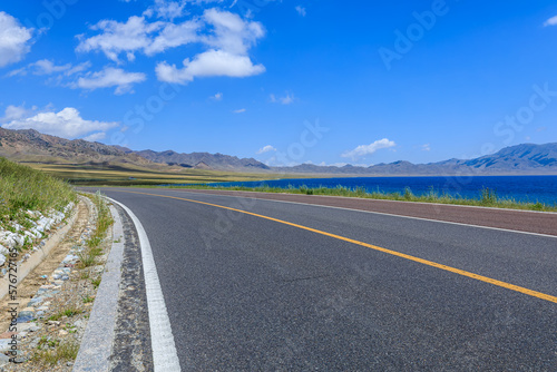 Asphalt road and lake with mountain natural scenery in Xinjiang, China.