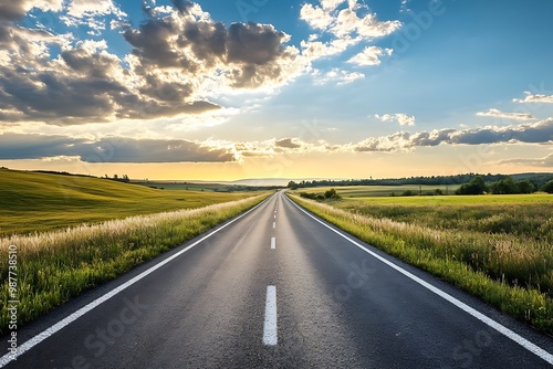 road, asphalt, horizon, sky, sunny, cloud, green, grass, field, empty, straight, travel, freedom, journey, adventure, landscape, nature, countryside, rural, open, perspective, distance, direction, pathway, drive, highway, route, destination, summer, sunset, sunrise, blue, white, line, driving, car, vacation, explore, wanderlust, long, endless