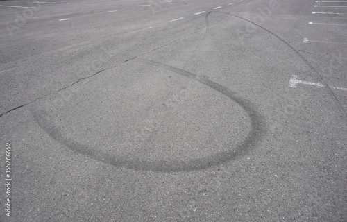 Asphalt texture with white line and tire marks. Smooth asphalt road. Tarmac dark grey grainy road background.Top view
