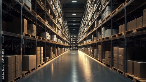 system, sorting, box, towering, warehouse, shelf, robotic, arm, moving, precisely, aisle, dim, industrial, lighting, reflective, surface