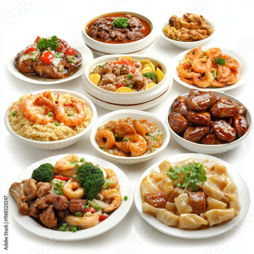 Assorted Asian Cuisine Display Featuring Shrimp, Chicken, Beef, and Dumplings on White Background for Gastronomic Delight