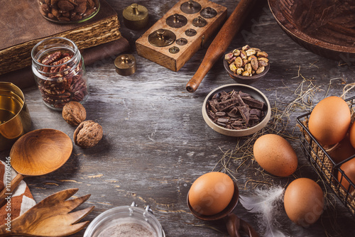 Assorted baking ingredients on wooden vintage table, in brown tone