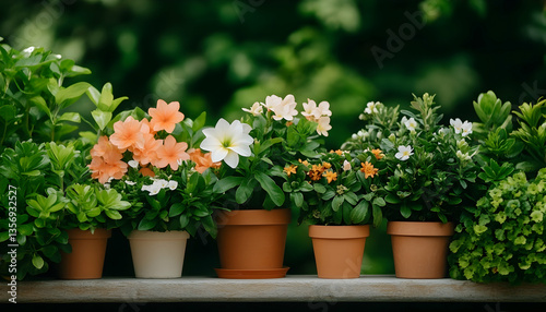 Assorted blooming potted plants in terracotta and white pots, arranged on a ledge against a blurred green background
