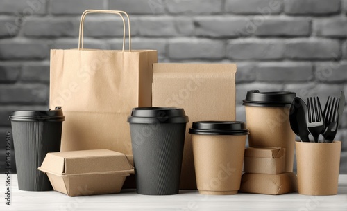 Assorted brown and black disposable food and beverage containers, including cups, bags, boxes, and cutlery, arranged on a white surface against a gray brick backdrop