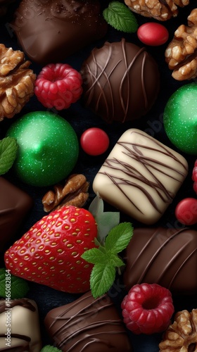 chocolate, chocolate, assorted, assortment, sweet, sweet, dessert, dessert, food, epicure, confection, confectionery, candy, candy, truffle, truffle, nut, nut, walnut, walnut, berry, berry, raspberry, raspberry, strawberry, strawberry, red, green, dark, background, closeup, closeup, presentation, design, elegant, tasty, delicious, indulgence, treat, treat, mint, leaf, leaf, texture, smooth