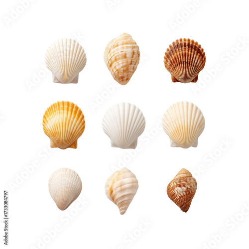 Assorted Close-up Views of Colorful Scallop Shells on a White Background for Nature and Marine Themes
