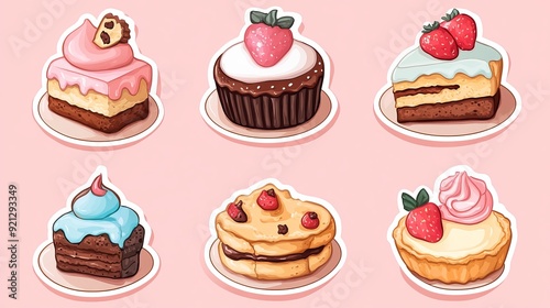 Assorted colorful desserts displayed on pastel background