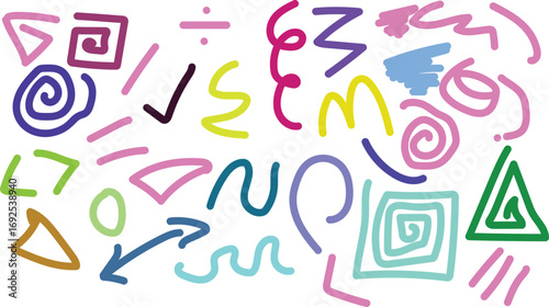 Assorted colorful hand drawn shapes and symbols scattered on a white background