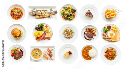 Assorted dishes including pasta grilled fish salad cake fries burger breakfast plate deviled eggs steak sausage soup sushi curry rice and stir fry arranged on white plates