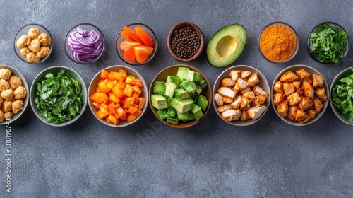 ingredient, food, bowl, chicken, avocado, pepper, tomatoes, onion, spinach, cilantro, turmeric, vegetable, snack, freshness, diet, cooking, meal, cookery, dish, vitamin, plant, nourishment, colours, delicious, chop, herb, spice, preparation, epicure, raw, tasty, healthy, vibrant, balanced, portion, organic, tabletop, grey, surface, arrangement, culinary, natural, closeup, top, overhead, texture
