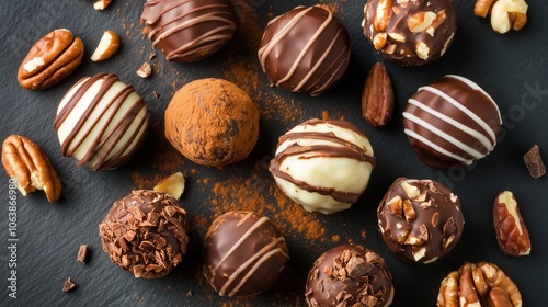 assorted, epicure, chocolate, truffle, display, tempting, selection, confection, dessert, sweet, treat, candy, nut, pecan, dark, milk, white, cocoa, textured, delicious, indulgent, delicacy, round, handcraft, rich, luxurious, snack, favor, aesthetic, closeup, food, background, copy, space, copy space, copy space, appealing, confectionery, artisan, sweet, arrangement, brown, surface, decoration