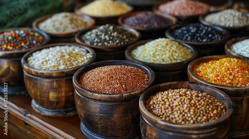 Assorted grains in wooden bowls at market. Assorted grains are displayed in wooden bowls at a market, showcasing a variety of textures and natural colors.