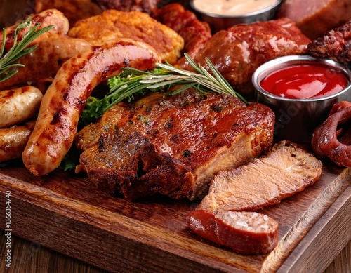 grilled, meat, sausage, rib, seasoning, platter, dipping, sauce, rosemary, wooden, bar-b-q, roasted, juicy, beef, pork meat, appetising, epicure, delicious, dining, feast, savoury, cookery, protein, hearty, grill, flavorful, smoke, cookout, tender
