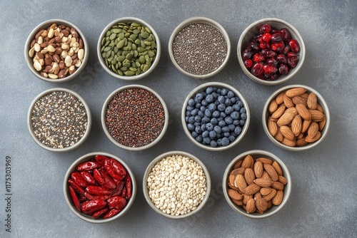 Assorted healthy seeds nuts and berries in bowls