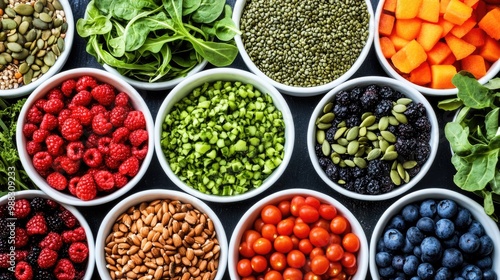 healthy, vegetable, fruit, berry, seed, bowl, assorted, display, vibrant, nourishment, diet, organic, fresh, natural, dietitian, antioxidant, vitamin, mineral, beauty, colours, arrangement, snack, wholesome, epicure, colourful, meal, essential, greenery, health, wellness, fiber, protein, culinary, macrobiotic, balanced, vegetarian, aesthetic, ingredient, vitality