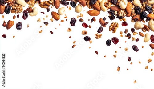 nut, almond, cashew, walnut, grape, dried, fruit, mixture, snack, healthy, food, ingredient, delicious, tasty, crunchy, sweet, organic, natural, alimentary, energy, protein, fiber, vitamin, mineral, antioxidant, breakfast, trail, mix, granola, receipe, autumn, winter, fall, harvest, brown, beige, white, background, isolated, falling, scatter, top, view