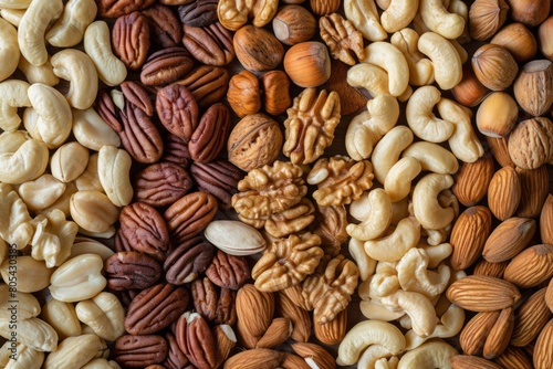 Assorted nuts, cashews, almonds, walnuts, pecans, hazelnuts, close up top view