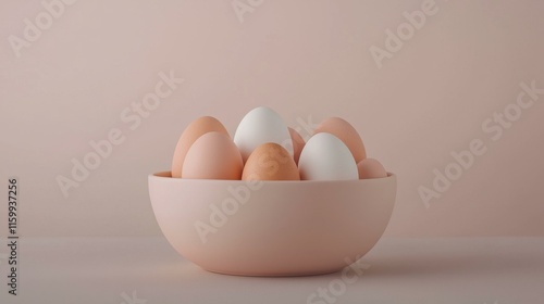 Assorted pastel Easter eggs arranged in soft peach bowl, featuring delicate white and light brown shades, creating serene festive atmosphere, ideal for seasonal decoration and celebrations.