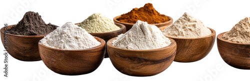 Assorted powdered ingredients in wooden bowls