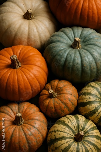 Assorted pumpkins and squash in rustic tones—orange, green, and white—perfect autumn harvest background or seasonal decor.