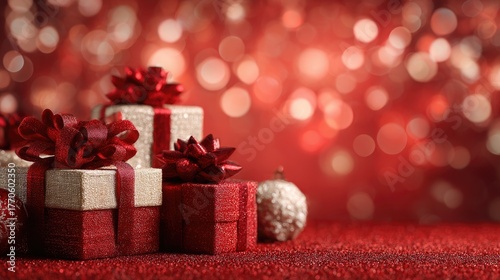 Assorted red gift boxes with ribbons among baubles and bokeh background. Christmas and New Year concept. Design for shopping ads, advertisement or banner with copy space for text.