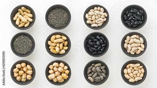 Assorted Variety of Seeds and Nuts in Black Bowls Arranged on a White Background