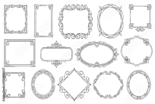 frame, border, ornament, vintage, elegant, decorative, swirl, scroll, filigree, thin, line, outline, vignetting, drawing, black, white, monochrome, set, collection, graphic, design, element, rectangle, oval, circle, square, diamond, shape, corner, victorian, retro, antique, classic, calligraphic, flourish, template, invitation, wedding, certificate, label, badge, title, text, luxury, formal, emblem, geometric, stylised