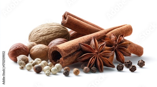 spice, cinnamon, nutmeg, star, anise, pepper, ground, whole, food, ingredient, cooking, baking, aromatic, brown, beige, natural, spice, blend, herb, dried, photo, closeup, isolated, white, background, healthy, eating, epicure, kitchen, eatery, cookery, oriental, eastern, fruit, organic, rack, tool, product, item