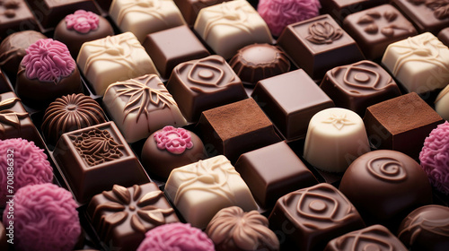 Assortment of chocolate candies, strawberry, and milk chocolate. Sweets background. Copy space.