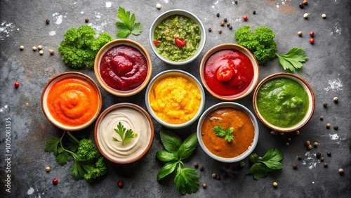 Assortment of Colorful Dips Arranged on a Rustic Surface, Ready to Elevate Any Meal