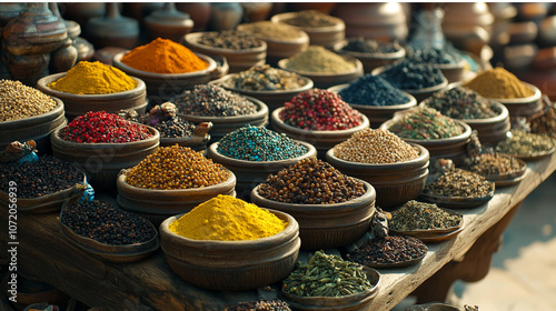 assortment of colorful spices beautifully arranged on a rustic wooden table, symbolizing cultural diversity, rich culinary traditions, and the vibrant essence of world cuisine and flavor