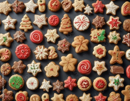 Assortment of delicious Christmas cookies in various shapes and designs, sugar, treats