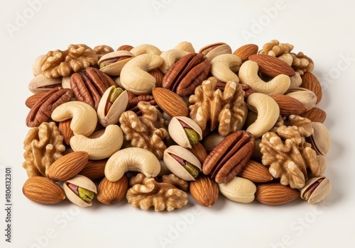 Assortment of mixed nut isolated on white background, including almond, cashew, pecan, pistachio, and walnut