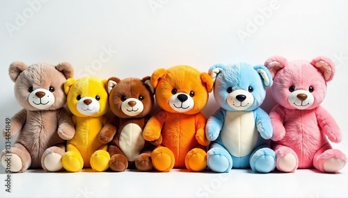 Assortment of plush stuffed animals in a row on white backdrop, playtime, cute, soft
