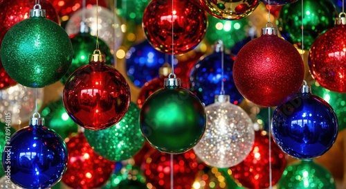 christmas, ornament, bauble, holiday, festive, decoration, colourful, red, green, blue, shiny, glittering, sparkling, bokeh, light, season, winter, celebration, joy, merry, traditional, glasses, sphere, round, hanging, background, blurred, abstract, bright, vibrant, party, event, december, new year, eve, greeting, card, design, wallpaper, pattern, texture, closeup, detail, macro, display