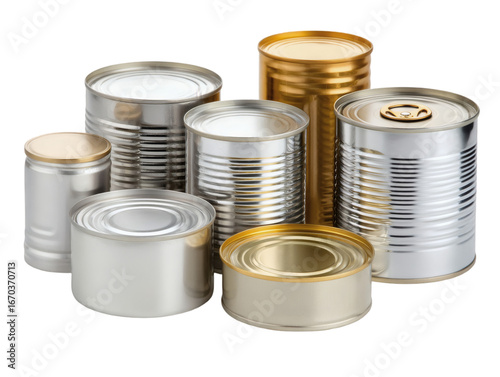 Assortment of shiny metal food cans ready for labeling and packaging design mockup