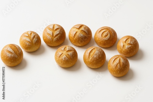 sourdough, bread, bakery, artisan, crust, crumb, score, scoring, pattern, arc, arrangement, neat, flour, dusting, gold, baked, yeast, fermentation, starter, rustic, craft, food, cookery, loaf, mini, small, assortment, studio, isolated, white, background, copy space, fresh, texture, detail, appetising, breakfast, snack, carb, wheat, grain, homemade, epicure, patisserie, display