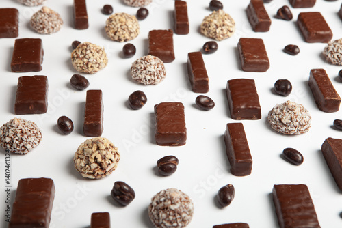 Assortment of sweet confectionery with chocolate candies and pralines. Children's holiday table with chocolate sweets