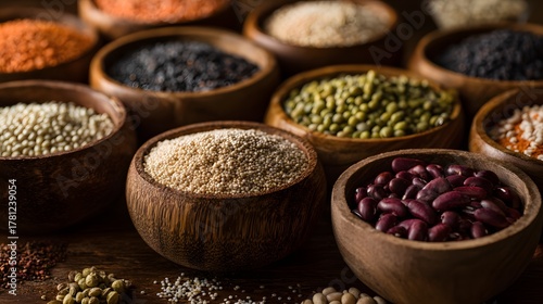 Assortment of various whole grains and legumes displayed in rustic wooden bowls