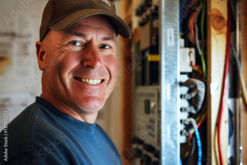 electrician, smiling, confident, expertise, residential, panel, open, project, challenge, professional, occupation, technician, skilled, men at work, maintenance, repair, service, industry, trade, wiring, inspection, safety, equipment, tool, job, electrical, specialist, ready, experienced, qualified, trained, background, career