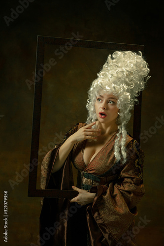 Astonished. Portrait of medieval young woman in vintage clothing with wooden frame on dark background. Female model as a duchess, royal person. Concept of comparison of eras, modern, fashion, beauty.