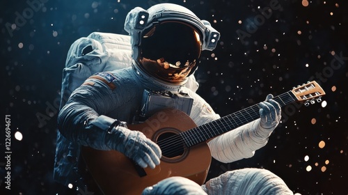 astronaut, guitar, space, music, floating, star, particle, weightlessness, creativity, suit, cosmic, performance, sound, instrument, exploration, outer, isolation, harmony, adventure, universe, art, rythm, celestial, activity