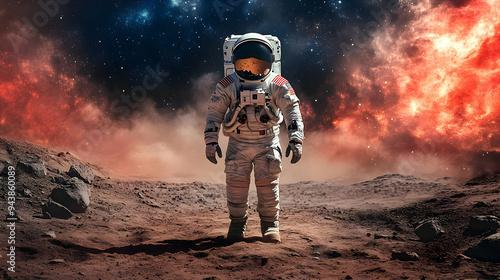 Astronaut standing on a red planet surface with a starry sky and red nebula.