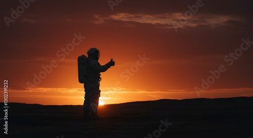 astronaut, sunset, space exploration, extraterrestrial, horizon, silhouette, adventure, outer space, sky, exploration, science fiction, cosmos, discovery, universe, planet, journey, solitude, technology, thumb up, calmness, nature, immensity, dramatic sky, shadow, optimism, imagination, warm colors, dawn, dusk, space suit, celestial, light, cosmic, epic, surreal, minimalist, inspiration, visionary, remote, evening, generative, ai