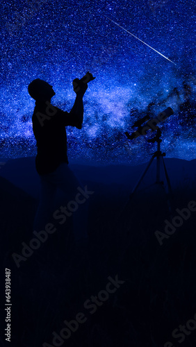 telescope, instrument, astronomic, star, space, galaxy, man, male, guy, person, starlight, starry, planet, milky way, astronomy, astrology, universe, cosmos, science, night, sky, dark, twinkle, watching, horoscope, looking, cosmic, astronomer, shooting star, falling star, observing, meteor, silhouette, hobby, nature, eclipse, celestial, evening, landscape, mountain, suburb, rural, camera, astrophotography